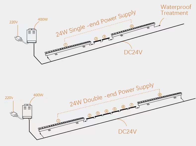 A single 400W power supply can power a combination of 24W wall washers with a total length of up to 12 meters. When powering from one side, the maximum length of a wall washer combination is 4 meters. When powering from both ends, the maximum length of a wall washer combination is 8 meters.